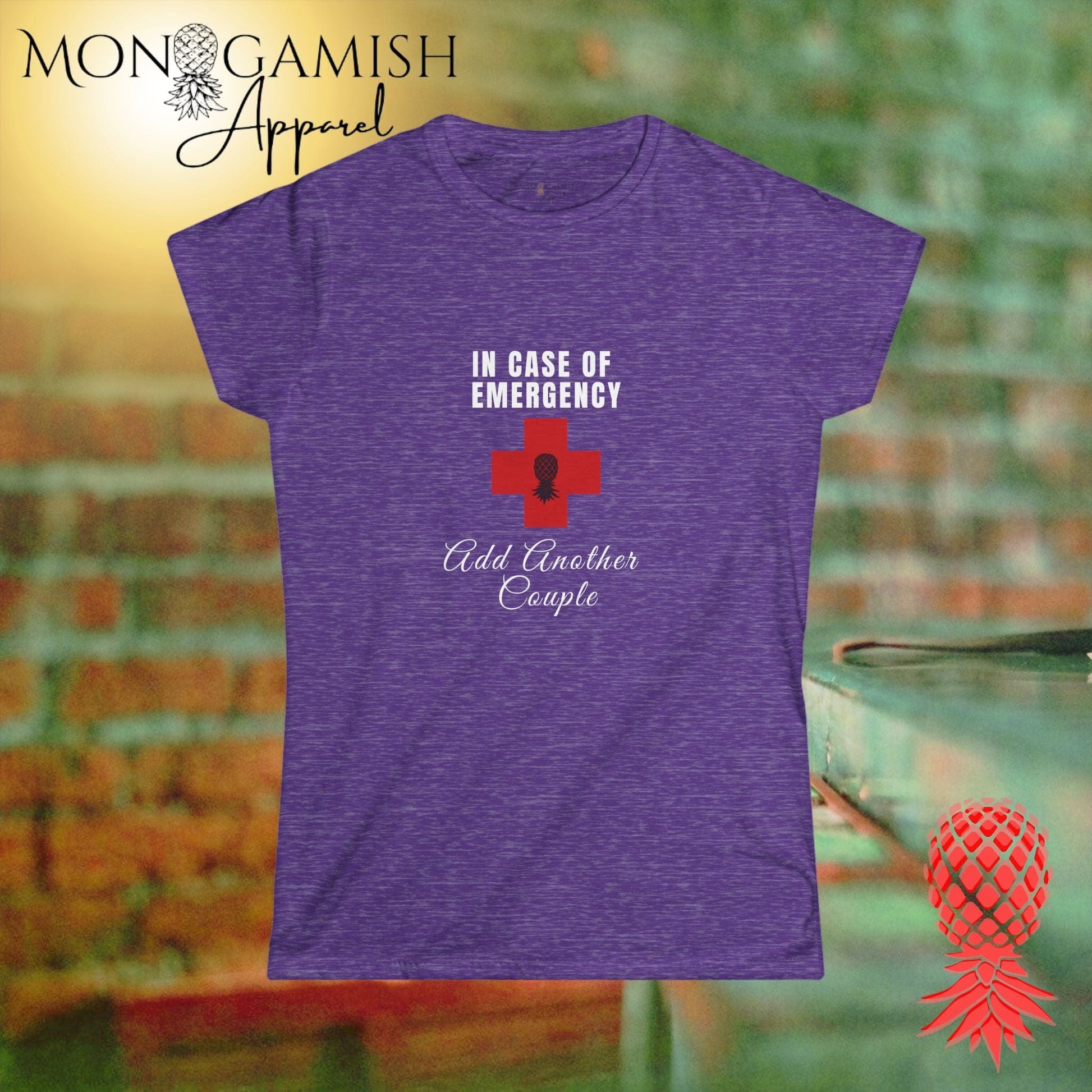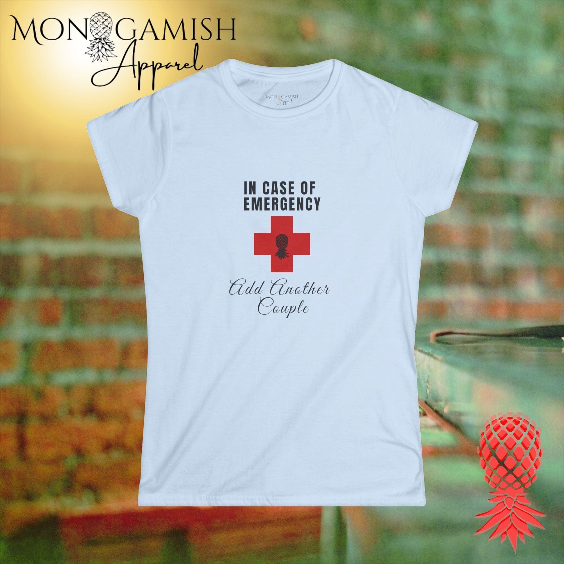 This ladies tee delivers the perfect dose of sass and suggestion with its bold red cross and the phrase “In Case of Emergency, Add Another Couple.” Designed in a flirty mix of strong sans-serif and elegant script, it subtly signals your lifestyle status with a centered upside-down pineapple. Whether you’re hitting a resort, hosting a playdate, or sipping cocktails at a house party, this tee is a classy way to say you’re open to options—and always ready for a little extra excitement.