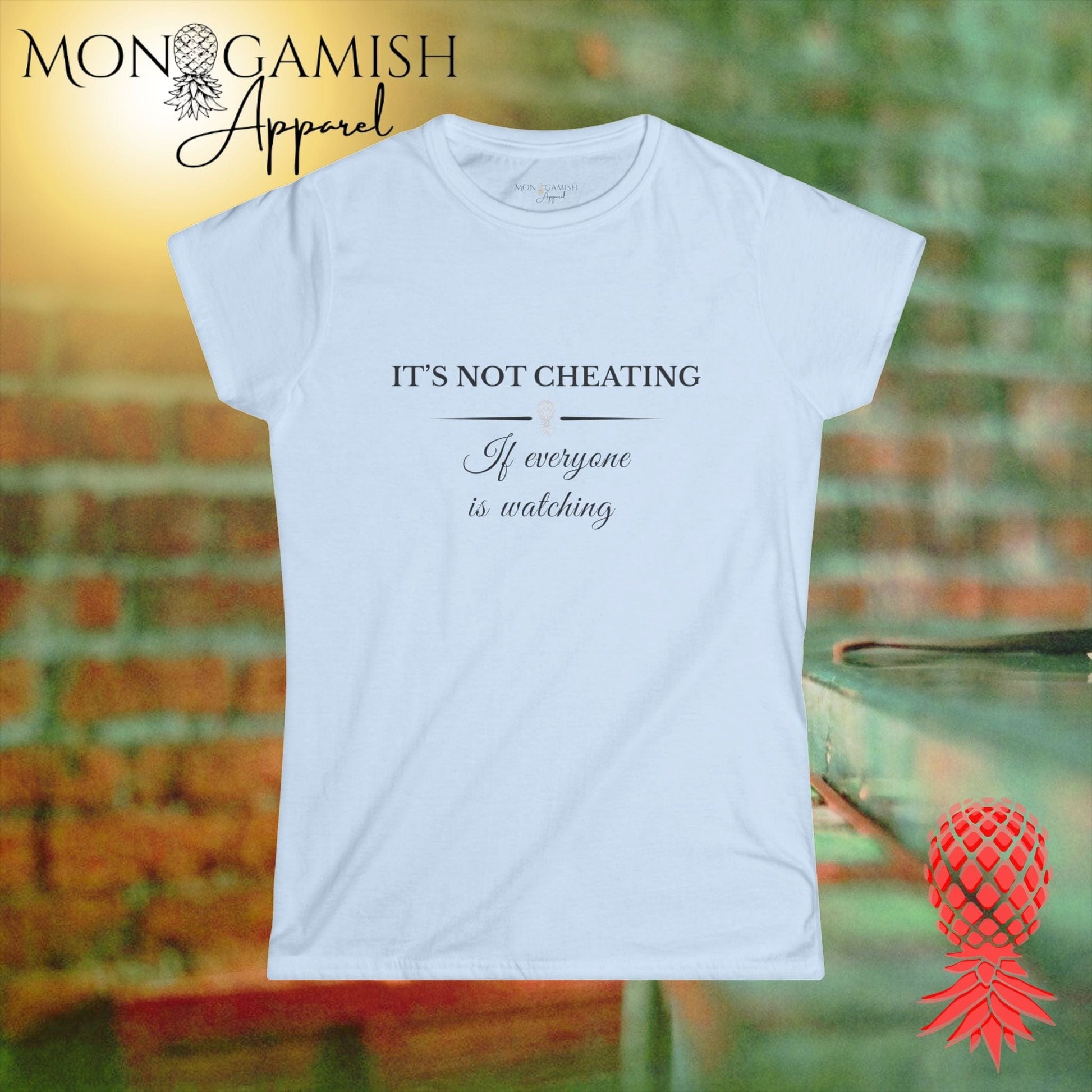 This tee takes playful provocation to the next level with the phrase “It’s Not Cheating If Everyone is Watching,” served up in a stylish blend of serif and script. A subtle upside-down pineapple anchors the design between the lines, signaling your lifestyle mindset with class and confidence. Perfect for group-friendly events, same-room vibes, or parties where exhibitionism is part of the fun, it’s bold without being crude—and irresistibly suggestive to those in the know.