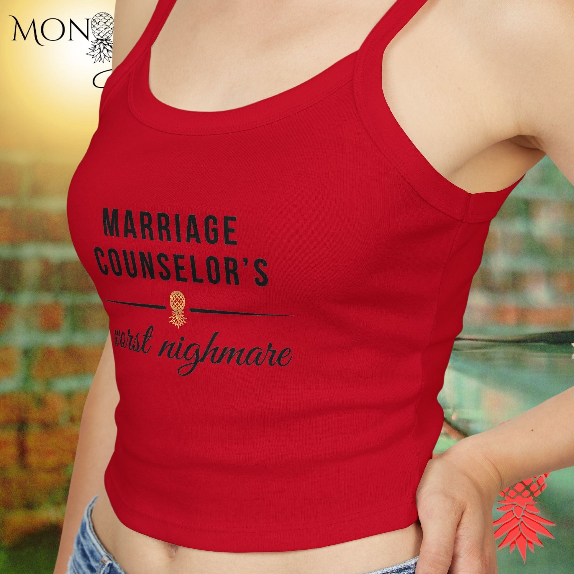 For the woman who's rewriting the love playbook and doing it in style, this crop tank turns heads without trying. “Marriage Counselor’s Worst Nightmare” is laid out in a sleek blend of modern type and sultry script, with a golden upside-down pineapple tucked subtly between the lines. The cut is cropped, the message is loud, and the vibe is pure confidence—made for poolside parties, girls' weekends, and anywhere the rules don’t apply.