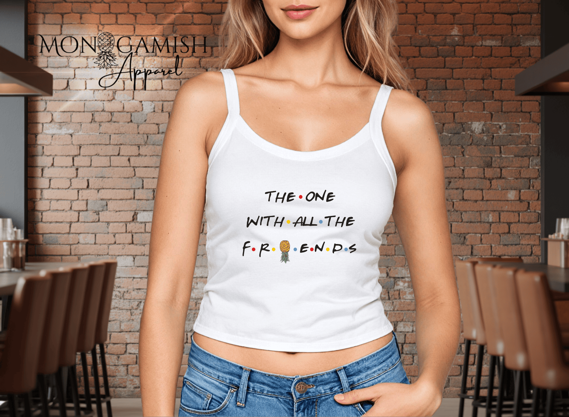 This playful tee reimagines a classic pop culture style with a lifestyle twist: β€œThe One With All the Friends,” complete with colorful dots and a cheeky upside-down pineapple in place of the β€œI.” Perfect for insiders who appreciate clever signals and subtle humor, this design blends nostalgia with a wink toward adventurous friendships. Wear it to parties, vacations, or casual nights out and let everyone know your circle is more than just social.